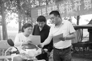 項城市秣陵鎮積極做好夏季秸稈禁燒工作,實行班子成員包片、機關干部包村、村組干部包戶責任制,全力構筑了秸稈禁燒“防火墻”。圖為6月8日該鎮干部在李閣村向過往群眾發放禁燒宣傳單。(張永久 攝)