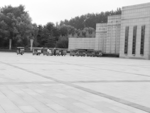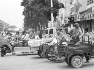 圖①  周口師范學(xué)院大門前又見排成一行的“紅頂三輪車”在從事非法營運,沒人進行管理。