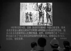 ② 7月12日,觀眾在中國人民抗日戰爭紀念館觀看1937年12月14日,日本《東京日日新聞》記者淺海、鈴木在南京紫金山麓發出的關于日軍第16師團富山大隊副官野田毅、炮兵小隊長向井敏明殺人比賽的報道。