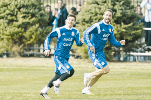 當地時間3月24日,阿根廷隊球員梅西(左)與隊友在訓練中。當日,阿根廷隊在美國華盛頓訓練,備戰28日與南非隊的熱身賽。新華社發