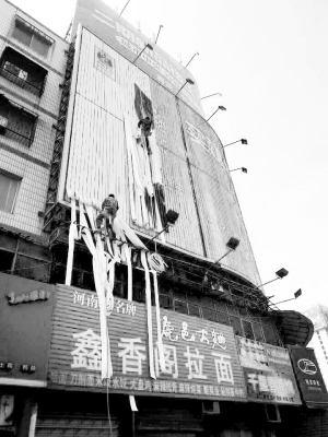 4月9日上午,在周口市區(qū)七一路與大慶路交叉口,兩名工人忙著整修廣告牌,他們“攀附”在墻上的身影,如同電影里的“蜘蛛俠”,讓過往市民無(wú)不敬畏勞動(dòng)者的辛勞與偉大。晚報(bào)記者 張志新 攝
